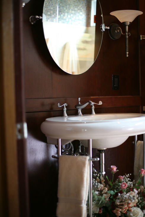 The pedestal sink with two legs, instead of a central center stand, gives leg room for someone in a wheelchair. And, as both owners of the home are fully able bodied now, behind the walls is blocking for future grab bars, if needed.